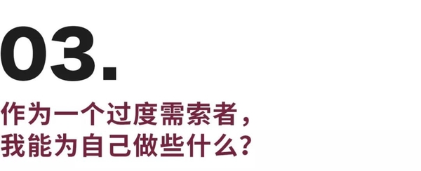 因此,你可以试着将视角从“应该怎样”转移到观察和接纳眼前这个人、这段关系“是怎样的”。比如,过度需索者往往只认可宣之于口的爱的表达,但从“应该”视角到“接纳”视角,他们要学会不止是凭借伴侣的话语来确定对方爱自己;而是注意到更多线索,学习和理解对方爱人的方式,综合做出对两人关系的判断。