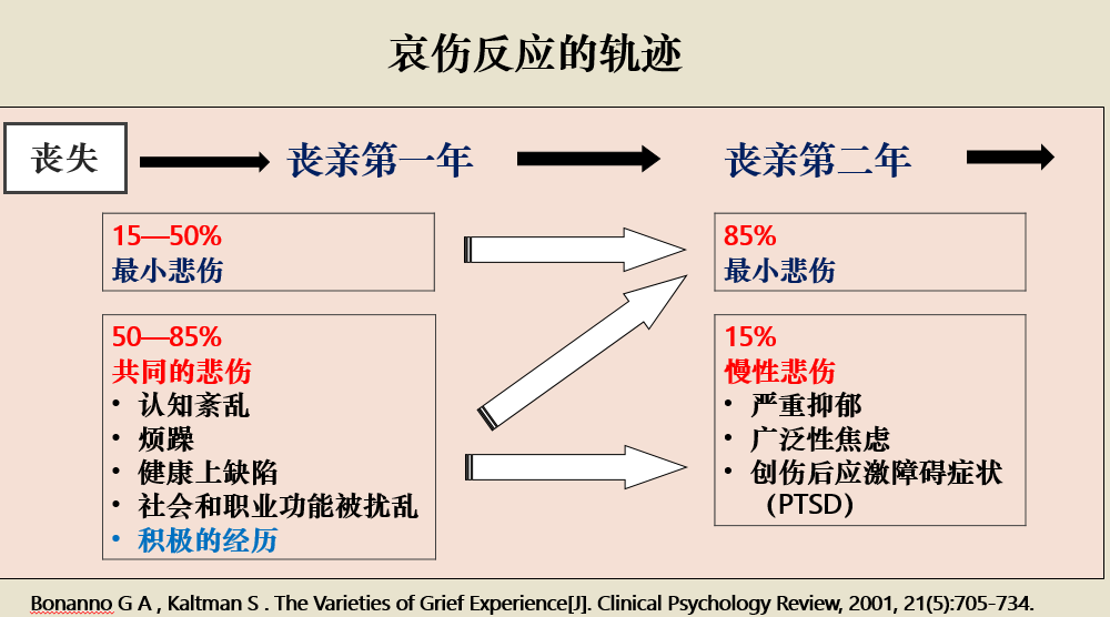 我们还是再回到哀伤的议题中来,什么是哀伤?因为之前也有课在涉及到这些定义,所以我就不再展开讲。在英文里面其实有4个比较关键的词,如果你有兴趣做哀伤辅导领域的相关工作,那么这4个关键词要特别重视起来,一个是loss,也就是丧失,事件发生之后随之而来的就是哀伤bereavement,英文如果翻译过来的话,应该是丧亲。整个哀伤这个词可以分成两个部分,一个是悲伤,叫grief,另外的一个部分是哀伤,mourning。这两个部分其实有交叉,但是也处理着不同的任务,悲伤更多的是一种情绪和情感的表达,而哀悼是表现在一些行为上,但是这两个部分不是绝对的,不是完全分开的。通常情况下,我们会把哀伤作为丧亲发生以后,丧亲者在多个层面所表现出来的一个整体的状况来看,当然哀伤它会有一定时间上的持续和强度上的不同。有一些学者的研究显示,大约有40%的哀伤者、丧亲者在丧亲后一个月内符合重症抑郁的标准,大约有15%的人在丧亲一年后还符合重症抑郁的标准。由此可见,对于哀伤的处理干预得越早越好。